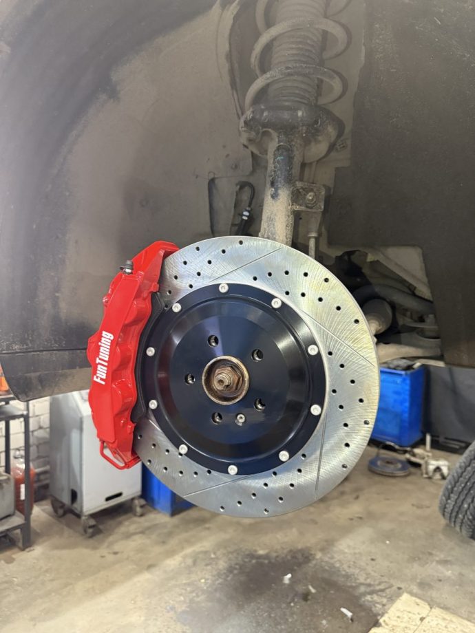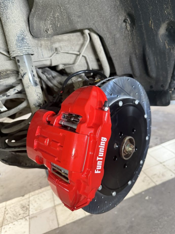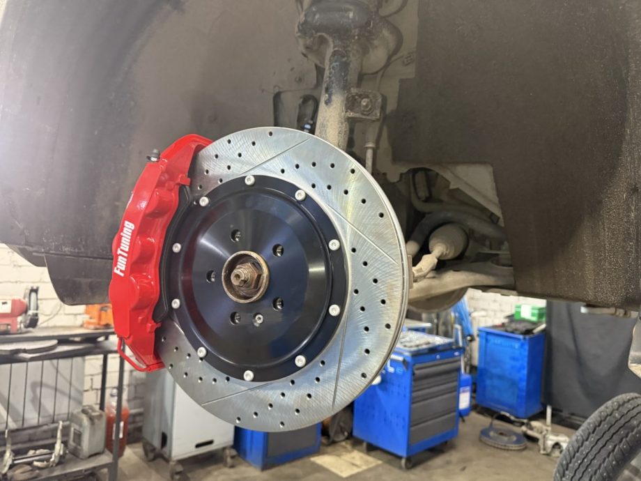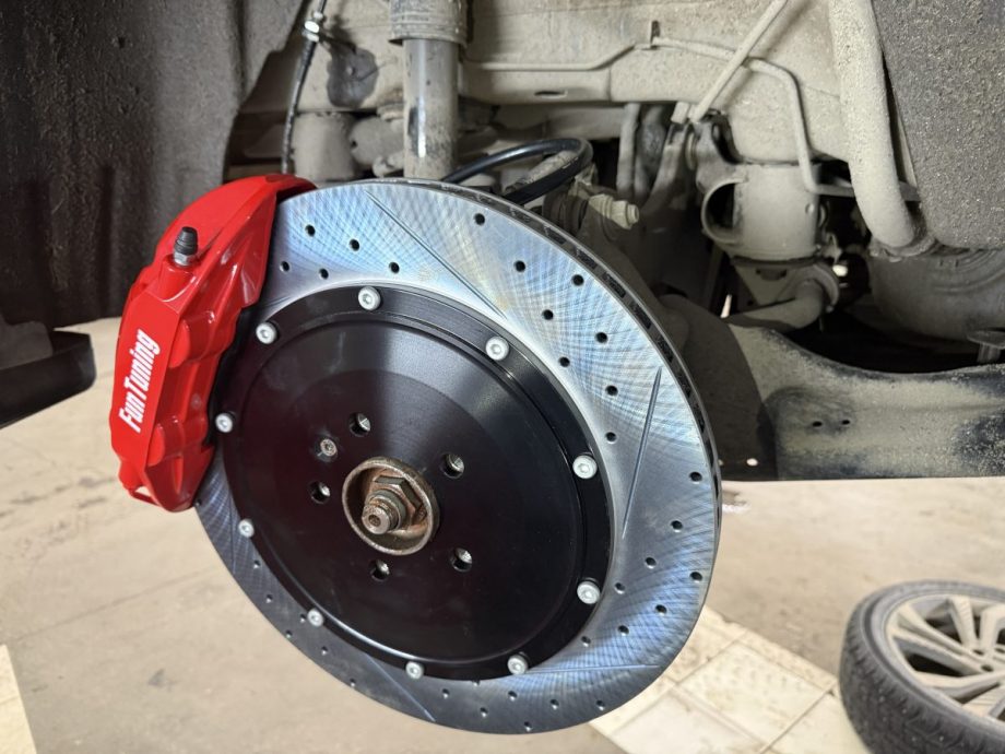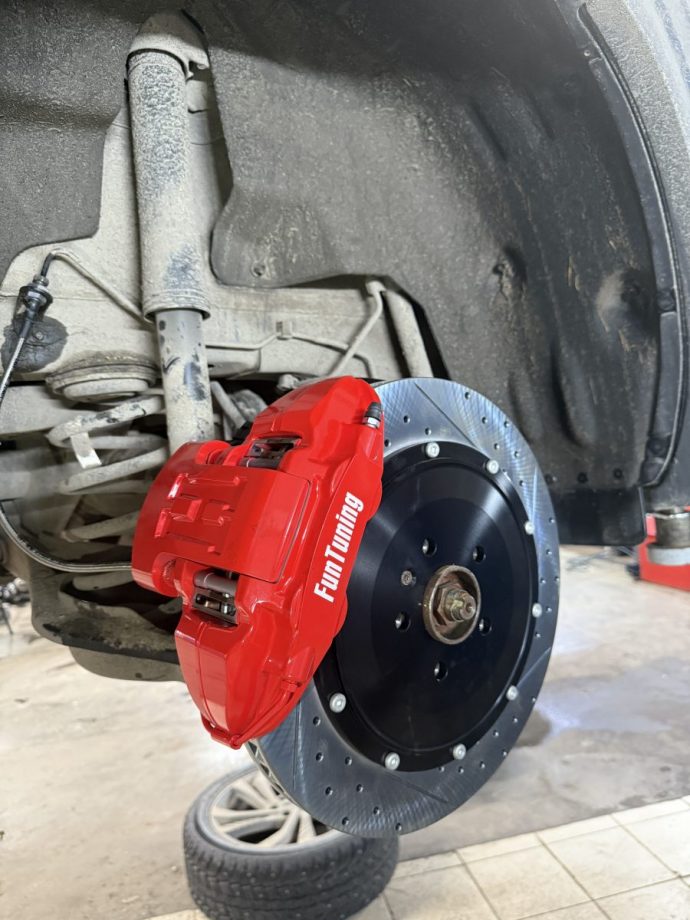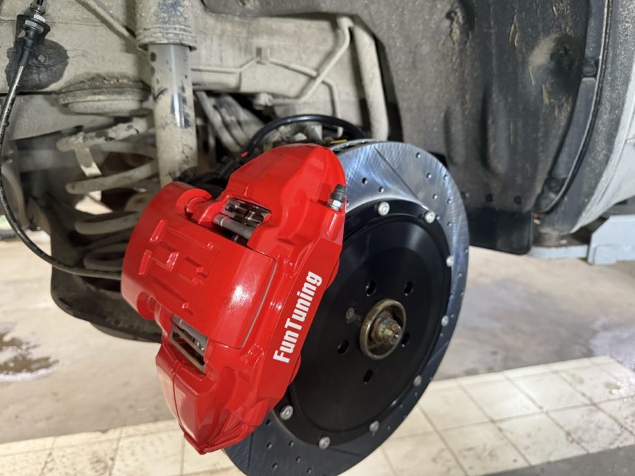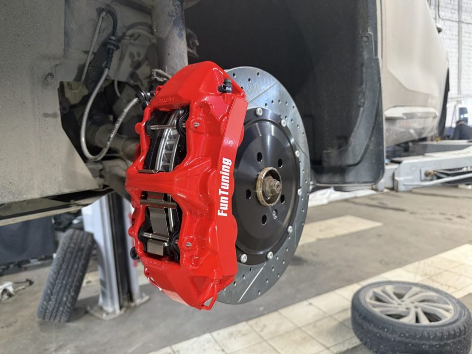 Передняя ось — 6 поршневая система с диаметром диска 380 мм, диски перфорированные с насечками.