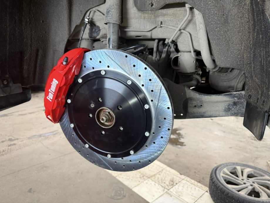 Задняя ось — 4 поршневая система, 380мм радиус диска, с электроприводом, диски перфорированные с насечками.