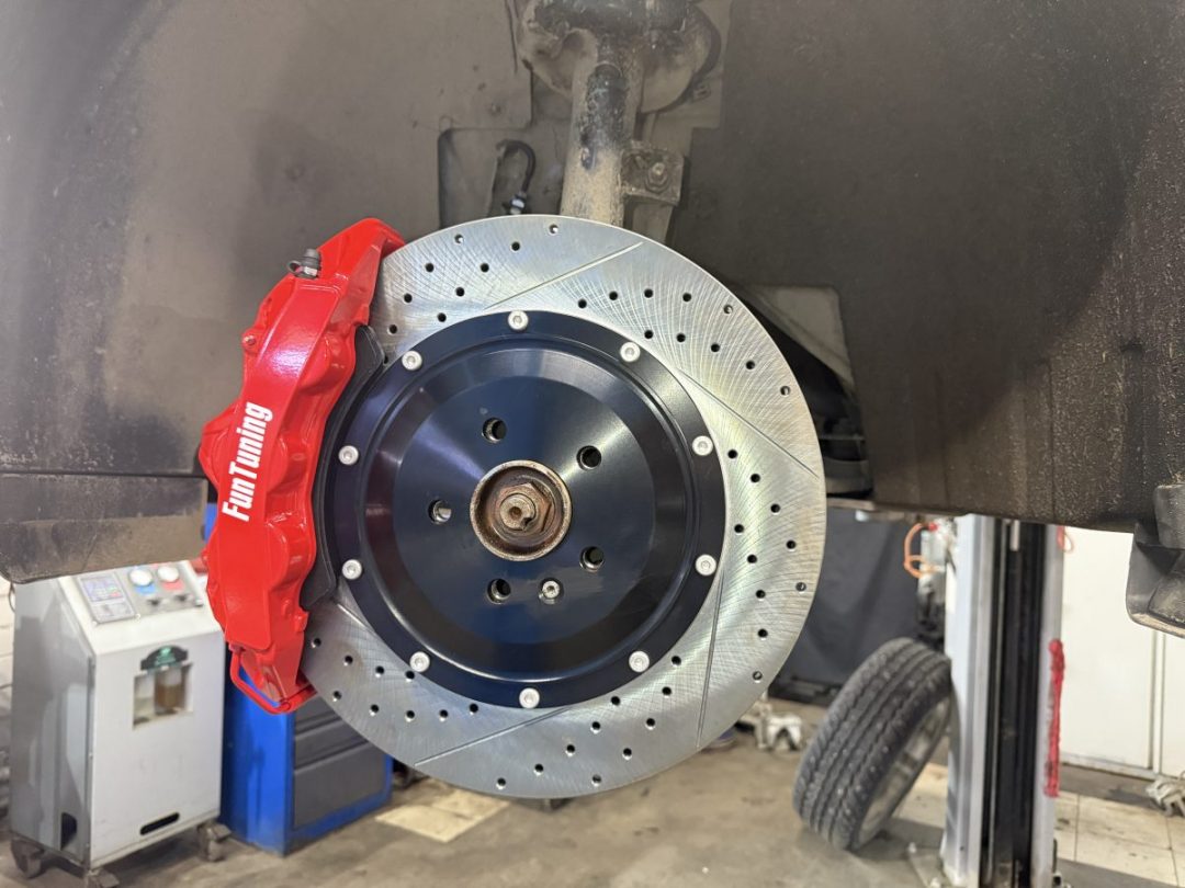 Передняя ось — 6 поршневая система с диаметром диска 380 мм, диски перфорированные с насечками.